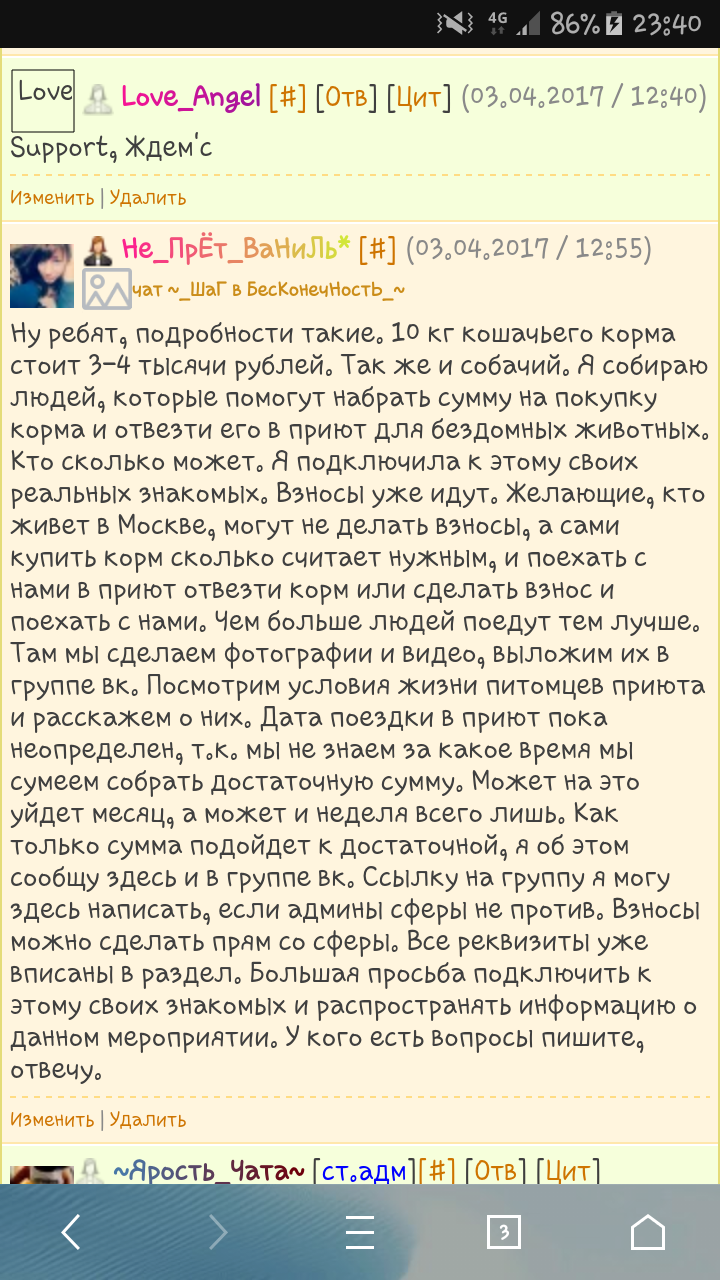 Для особо недоверяющим предоставляю скрин где я писала что поездка в приют может быть и ЧЕРЕЗ МЕСЯЦ, смотря как будут идти вложения))) так что успокойтесь люди, которые кричат что я врушка, типа как дама с ником укус) я слилась куда то?) Нет, я здесь и связь со мной имеют многие) так что возмущения прошу не писать))