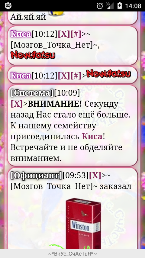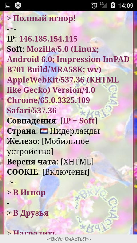 NarGiZ, я ничего не врубаю и не вырубаю и всех кто будет тут плакаться что у них рекламят считаю тряпками.Раньше рекламили каждую минуту ну забанят кто в игнор кинет но не бегали и не жаловались.Я бы промолчал но почитал как вы заплакали мне стало обидно и тошно за нынешник сисав.Ни один уважающий себя не пойдет сюда плакать а решит как то эту проблему хоть я это и проблемой не назову.