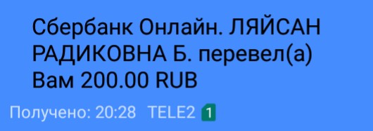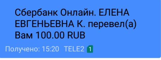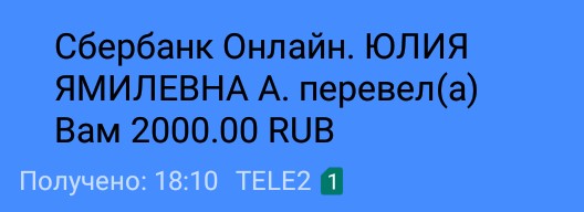 Так это я,вчера перевела,отправила деньги 1250р.Спасибо солнце..)